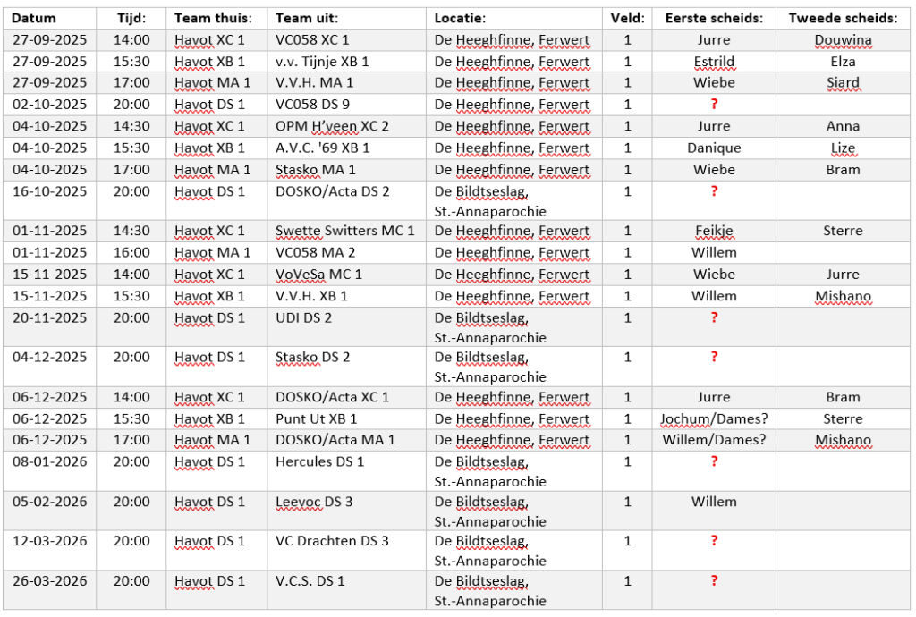 Scheidsrechterschema s.v. Havot – seizoen 2025-2026
